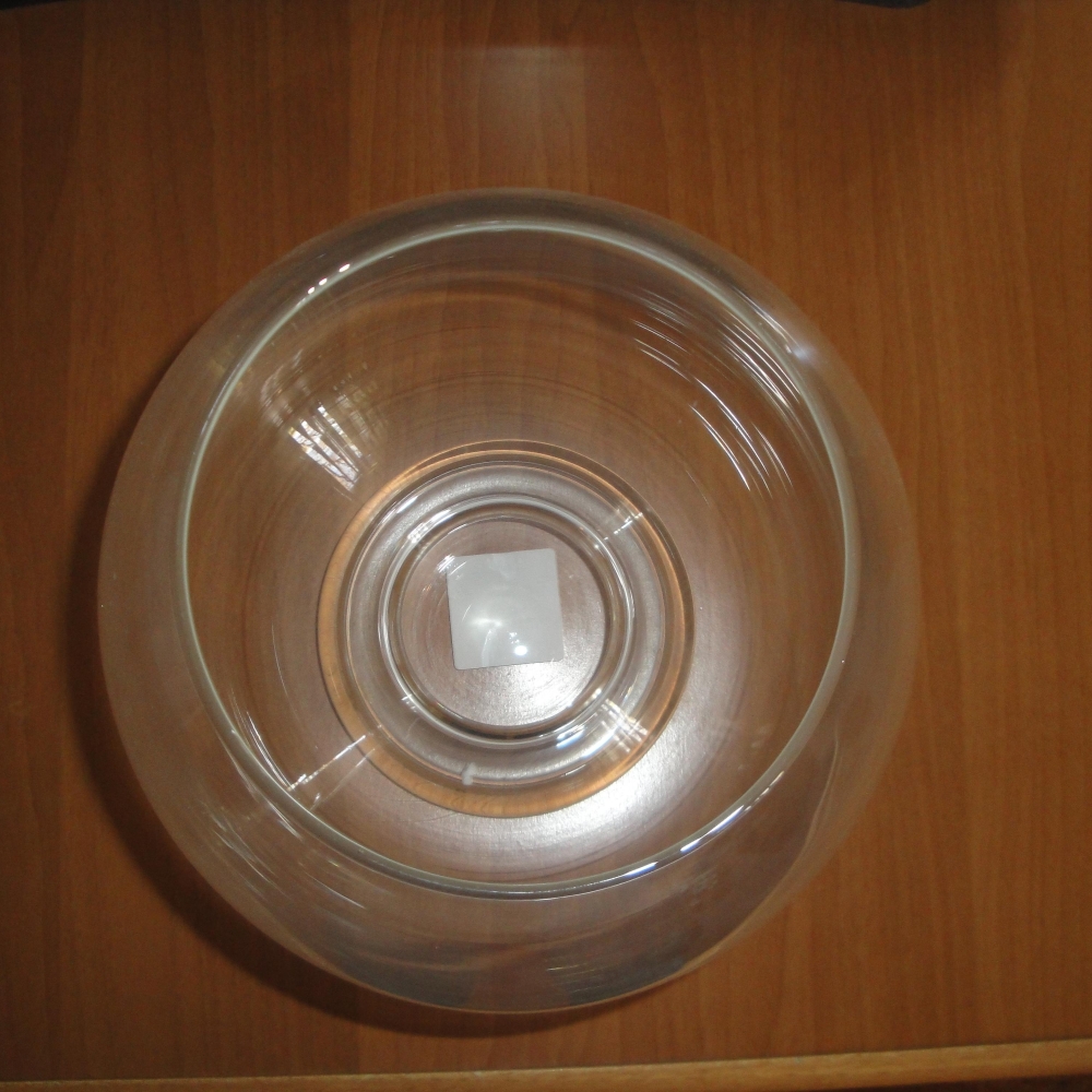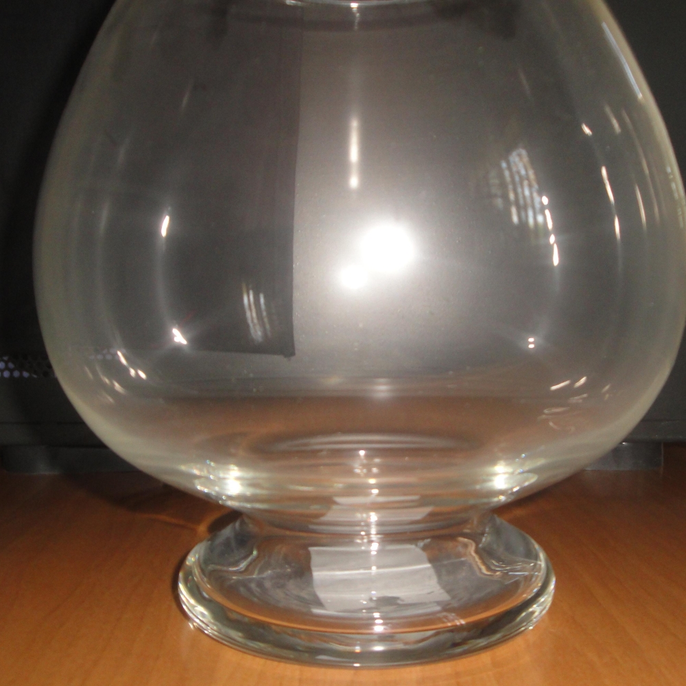 Диаметр горлышка 15 см, диаметр в широкой точке 21 см, высота 21 см, диаметр ножки 13 см, толщина стекла 3 мм.