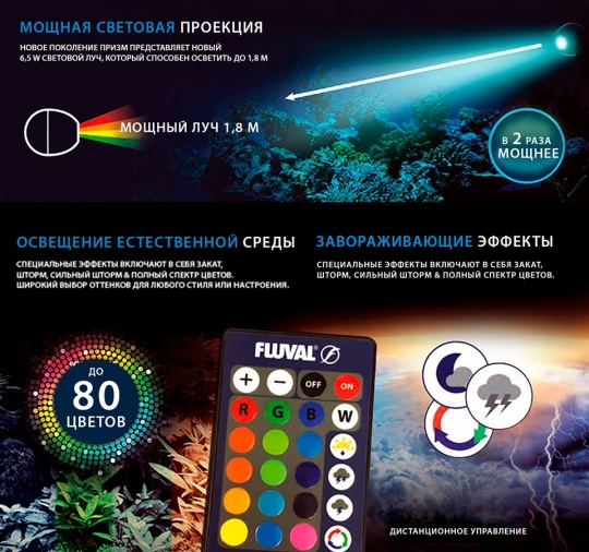 Основные характеристики Настраивается 80 цветовых комбинаций Мощный световой поток преодолевает расстояние до 1,8м Имеет разнообразные эффекты: заказ Солнца, шторм и автоматическое управление полным спектром цвета В 2 раза мощнее предыдущей версии Управляется пультом ДУ Маленький и незаметный (всего 3,8 cm) Лучше устанавливается в аквариумы, благодаря компактной форме и черному цвету Позволяет направлять поток света на 4 направления Легко устанавливается, благодаря присоскам Индекс водонепроницаемости IP68 Предназначен для работы под водой