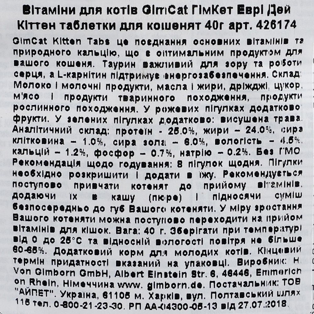 Комбінація життєво необхідних вітамінів та кальцію робить GimCat Kitten Tabs ідеальним продуктом для вашого кошеняти. Таурин важливий для зору та роботи його серця, а L-карнітин підтримує енергійність і життєрадісність малюка.