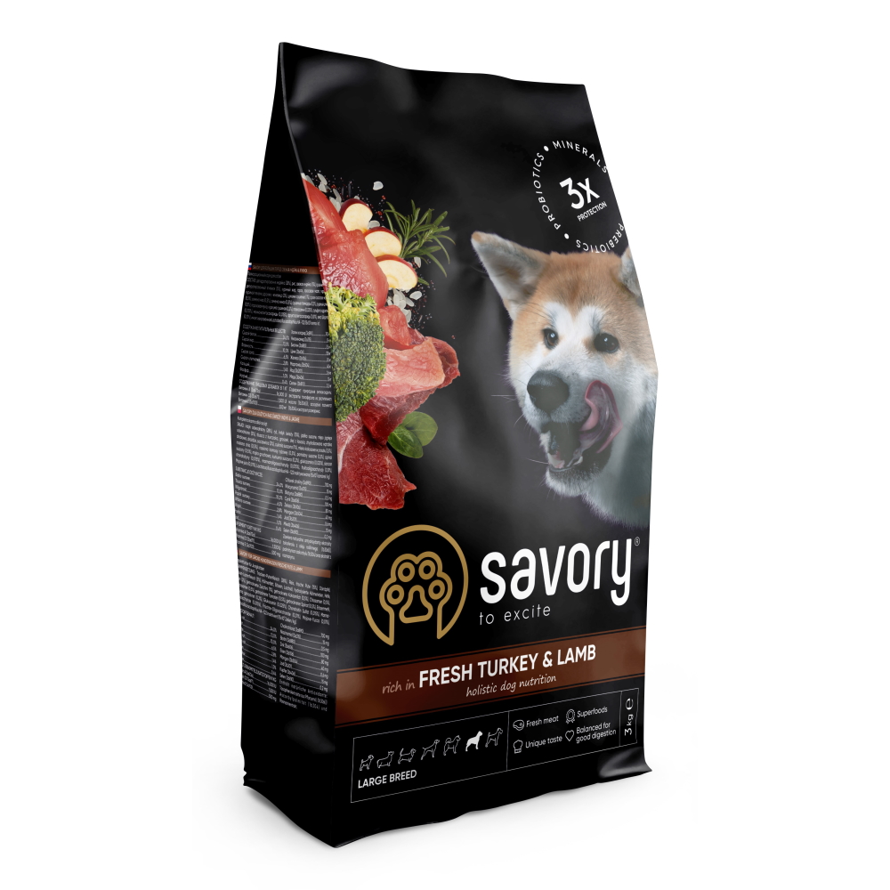 Сухий корм для собак великих порід Savory містить якісне м’ясо індички та ягняти, суперфуди, помідори, сочевицю і цукіні. Ці компоненти створені природою для оптимальної кондиції, міцних м’язів і здорових суглобів у чотирилапих велетнів.