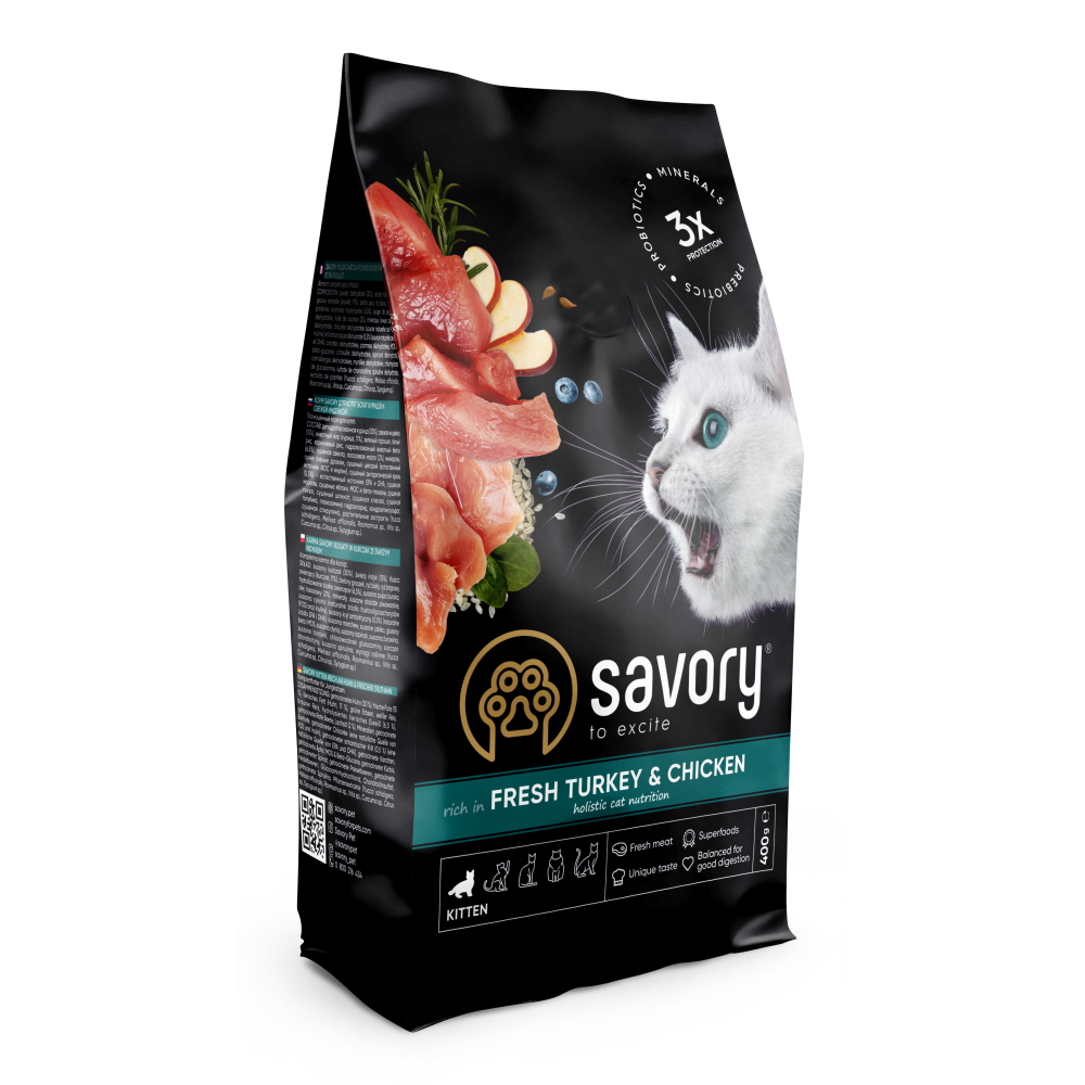 Сухой корм для котят Savory содержит свежее мясо индейки и дегидратированное мясо курицы, ягоды, фрукты и овощи. Эти компоненты созданы природой, чтобы организм малышей получил необходимые питательные вещества для укрепления иммунитета, правильного развития и здорового роста.