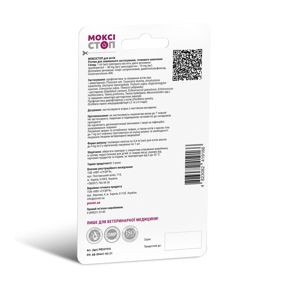 Краплі PROVET МОКСІСТОП проти гельмінтів для котів до 4кг, 1 піпетка