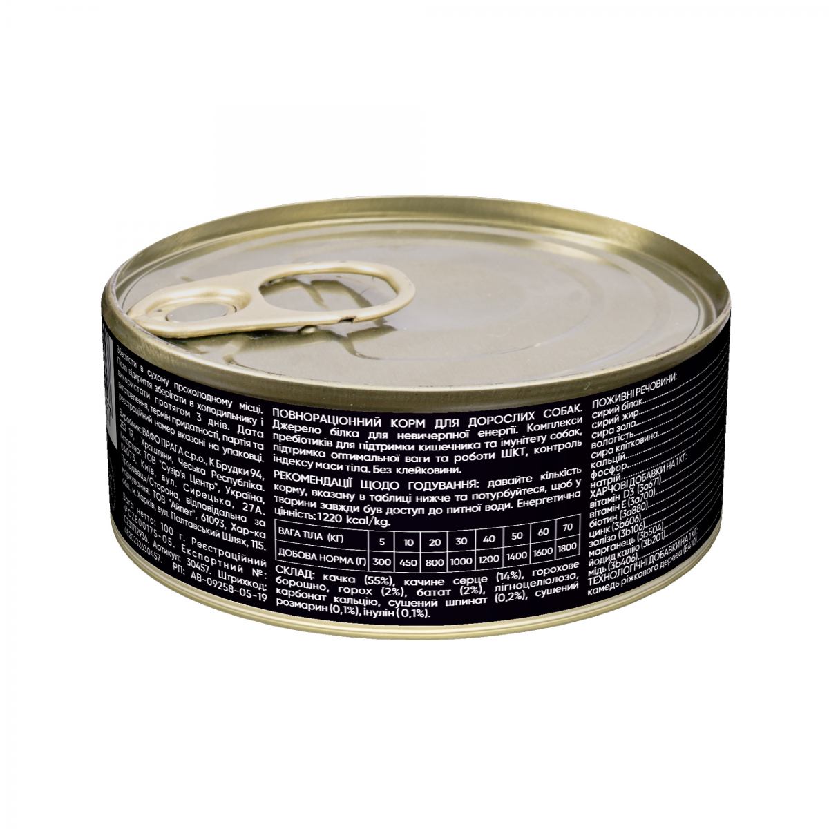 Состав: Качка55%, качине серце14%, горохове борошно, горох2%, солодка картопля2%, горохове борошно, горох2%, солодка картопля2%, лігноцелюлоза, карбонат кальцію, сушений шпинат0,2%, сушений розмарин0,2%, сушений шпинат0,1%, інулін0,1%.