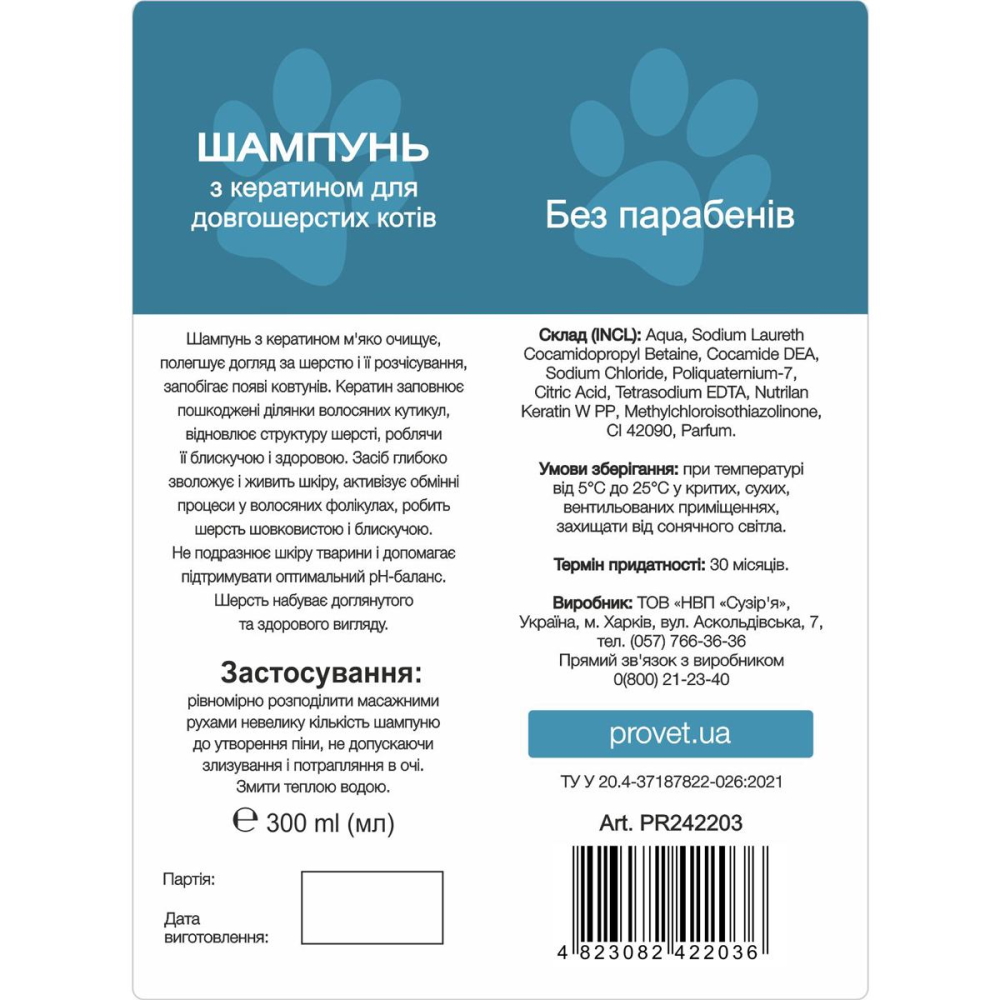 Описание: Шампунь с кератином мягко очищает, облегчает уход за шерстью и ее расчесывание, предотвращает появление колтунов. Кератин заполняет поврежденные участки волосяных кутикул, восстанавливает структуру шерсти, делая ее блестящей и здоровой.