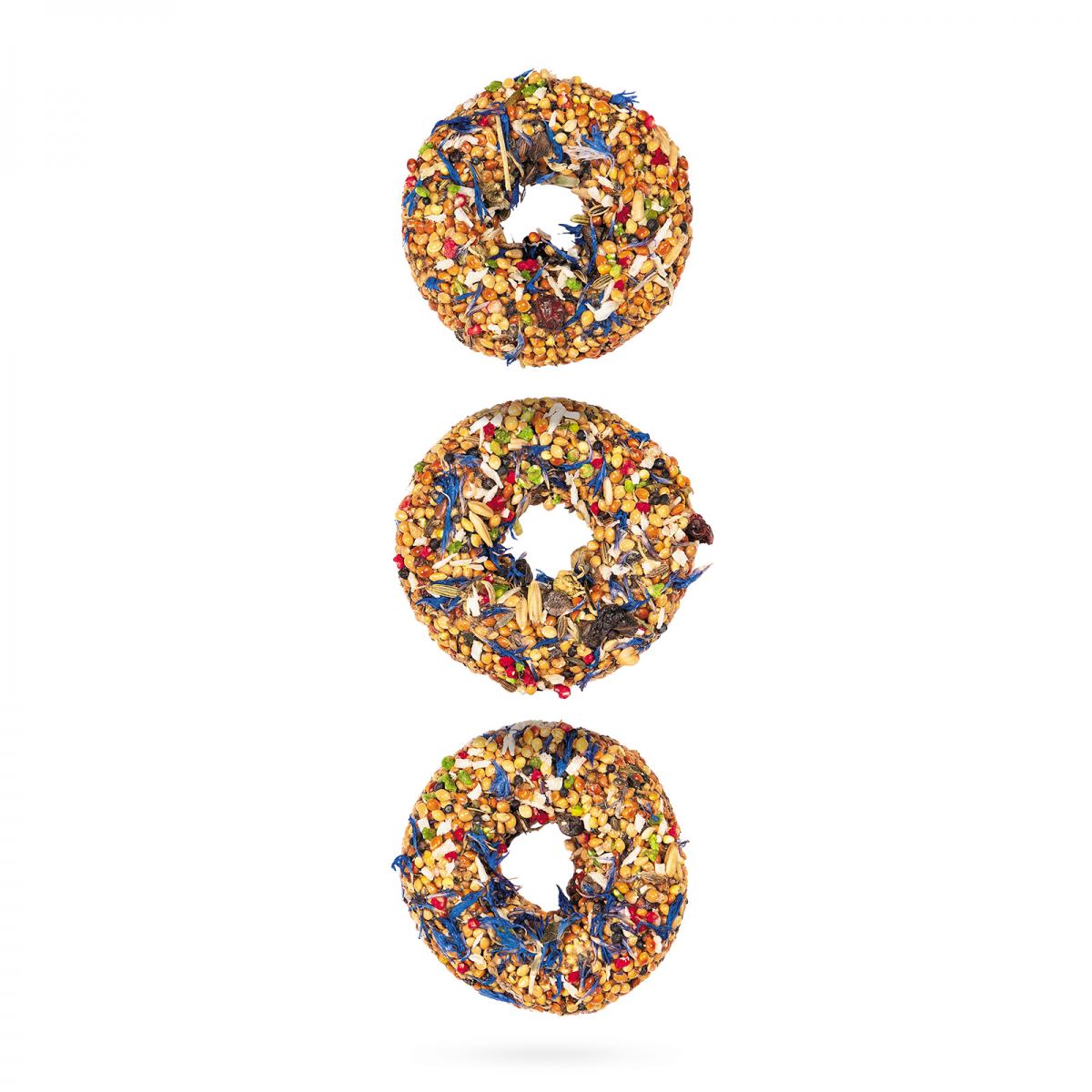 Рецептура ласощів розроблена спеціально для декоративних птахів, які утримуються в домашніх умовах. Смаколики чудово доповнюють раціон птахів корисними речовинами і дарують нові смаки. Барбарис, волошка та ромашка, кокосова стружка зміцнюють імунітет, зменшують наслідки стресу, покращують настрій та зовнішній вигляд. Пончик зручно кріпиться у клітці за допомогою спеціального тримача.
