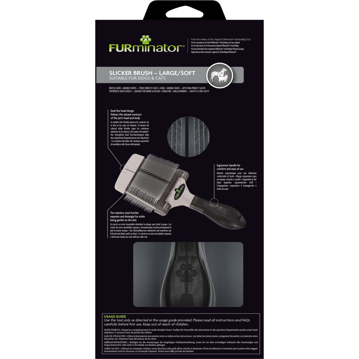 Описание: Мягкая щетка-пуходерка FURminator – это профессиональный инструмент для удаления колтунов и распутывания шерсти вашего питомца. После ее применения шерсть становиться гладкой и блестящей Щетка разработана специально для собак и кошек для собак и кошек с шелковистой и жесткой шерстью. Двусторонняя щетка-пуходерка не травмирует кожу, несмотря на то, что щетина двух видов сделана из нержавеющей стали: изогнутые щетинки помогают удалить колтуны и спутанную шерсть, не повреждая ее, а прямые щетинки – сделать шерсть гладкой и блестящей. Двусторонняя конструкция с гибкой насадкой повторяет естественные контуры головы и тела питомца, что не только облегчает груминг, но также доставляет удовольствие вашему любимцу. Эргономичная ручка гарантирует удобное и безопасное использование. • Для безопасного и легкого распутывания шерсти, чтобы сделать ее чистой и здоровой • С мягкой щетиной для собак и кошек с шелковистой и жесткой шерстью • Изогнутые щетинки удаляют колтуны и спутанную шерсть, не повреждая ее • Прямые щетинки делают шерсть красивой и блестящей • Щетинки из нержавеющей стали не травмируют кожу • Двусторонняя гибкая насадка повторяет естественные контуры головы и тела питомца • Эргономичная ручка для максимально комфортного использования РЕКОМЕНДАЦИИ ПО ИСПОЛЬЗОВАНИЮ Чтобы расчесать питомца, выберите тихое место и удобное время для груминга. Осторожно расчешите шерсть в направлении ее роста и вверх, используя сторону щетки-пуходерки FURminator® с изогнутой щетиной, чтобы расправить или удалить спутанную шерсть или колтуны. После того как вы полностью прочесали всю шерсть питомца, переверните щетку на сторону с прямыми щетинками и расчешите шерсть, чтобы она стала гладкой и блестящей. С осторожностью используйте щетку в районе живота и груди. Чтобы расчесать хвост, сделайте пробор посередине и расчешите шерсть с обеих сторон. Будьте осторожны с такими чувствительными участками, как живот, бедра, хвост и уши. Всегда проводите щеткой по направлению роста шерсти.
