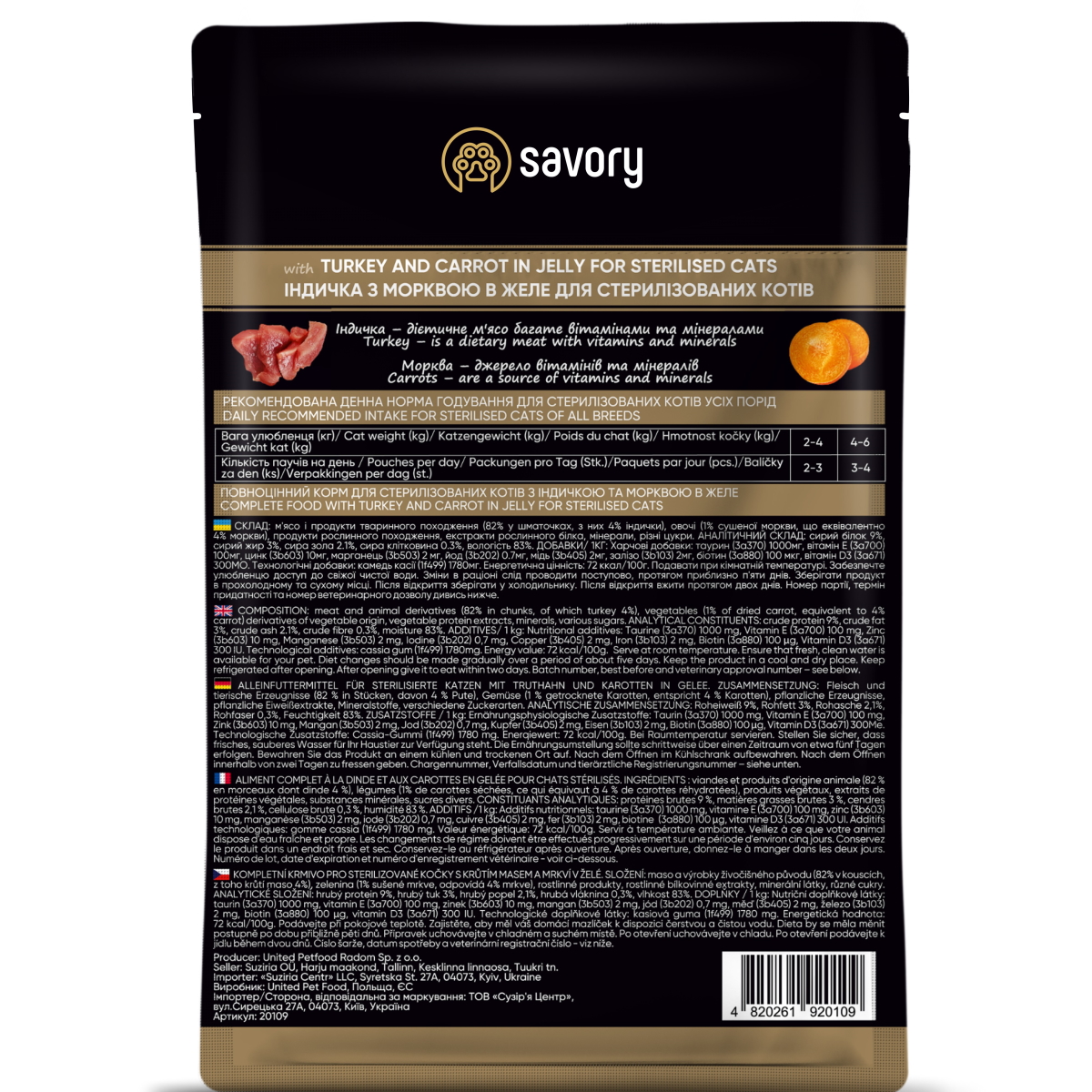 Описание: Полноценный влажный корм суперпремиум класса для кастрированных и стерилизованных котов и кошек "Savory кусочки индейки с морковью в желе". Для самостоятельного или комбинированного с сухим кормом питания любимцев, с момента их кастрации или стерилизации. Высокая влажность корма помогает любимцу поддерживать водный баланс во избежание засоливания и повышения концентрации мочи, что помогает избегать проблем с мочевыводящими путями.
