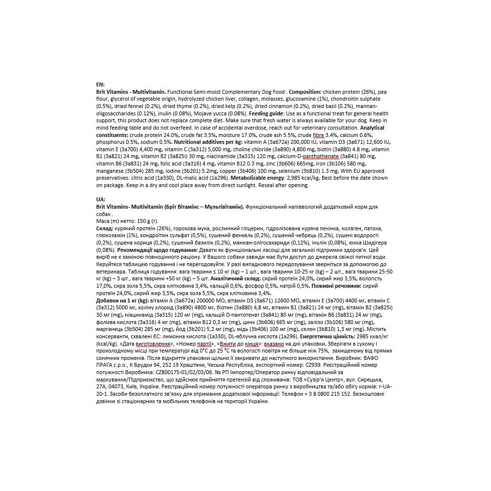 Добавки на 1 кг (kg): вітамін A (3a672a) 200000 МО, вітамін D3 (3a671) 12600 МО, вітамін E (3a700) 4400 мг, вітамін C (3a312) 5000 мг, холіну хлорид (3a890) 4800 мг, біотин (3a880) 4,8 мг, вітамін B1 (3a821) 24 мг (mg), вітамін B2 (3a825i) 30 мг (mg), ніацинамід (3a315) 120 мг (mg), кальцій D-пантотенат (3a841) 80 мг (mg), вітамін B6 (3a831) 24 мг (mg), фолієва кислота (3a316) 4 мг (mg), вітамін B12 0,3 мг (mg), цинк (3b606) 665 мг (mg), залізо (3b106) 580 мг (mg), марганець (3b504) 285 мг (mg), йод (3b201) 5,2 мг (mg), мідь (3b406) 100 мг (mg), селен (3b810) 1,3 мг (mg). Містить консерванти, схвалені ЄС: лимонна кислота (1a330), DL-яблучна кислота (1a296).