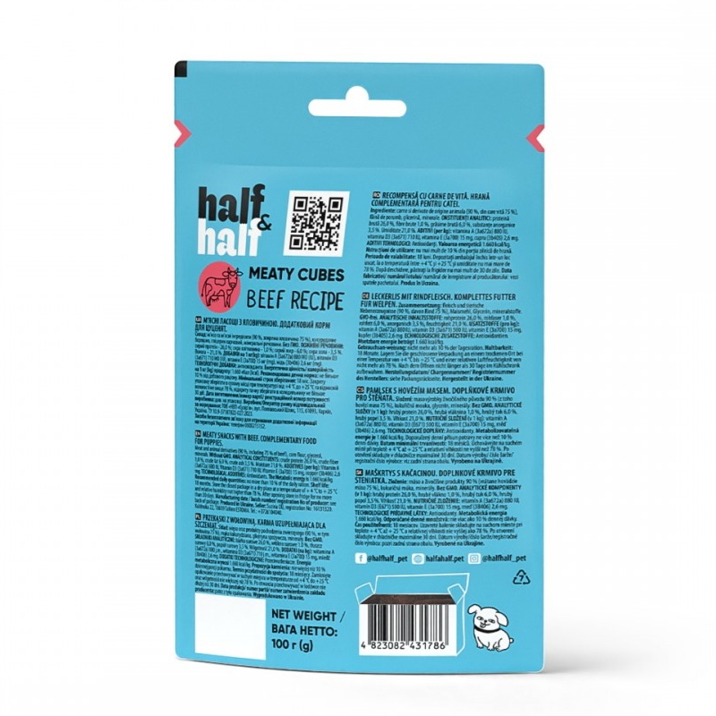 Каталог товаров : Ласощі та кістки для собак > Ласощі для цуценят Half Half м`ясні кубики з яловичиною 100г