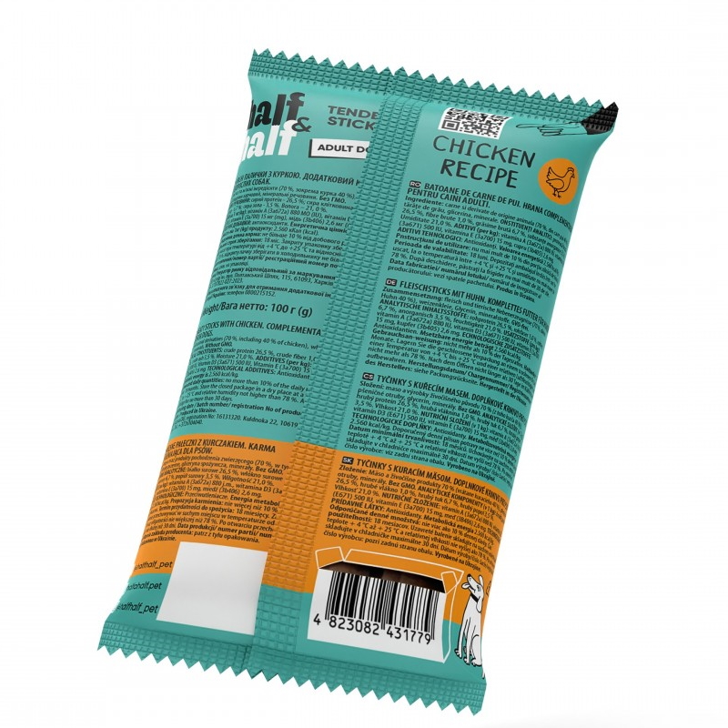 Каталог товаров : Ласощі та кістки для собак > Ласощі для собак Half Half м`ясні палички з куркою 100г