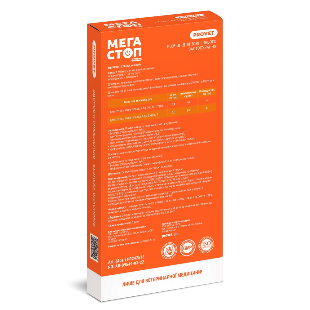 Описание: Краплі PROVET Мегастоп Ультра для котів до 4 кг та тхорів, 4 піпетки по 0,4 мл (інсектоакарицид, антигельмінтик)