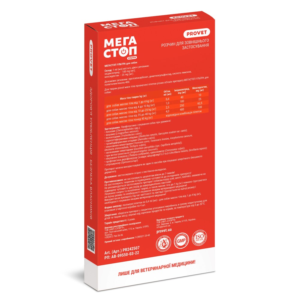 Описание: Краплі PROVET Мегастоп Ультра для собак до 4 кг, 4 піпетки по 0,4 мл (інсектоакарицид, антигельмінтик)