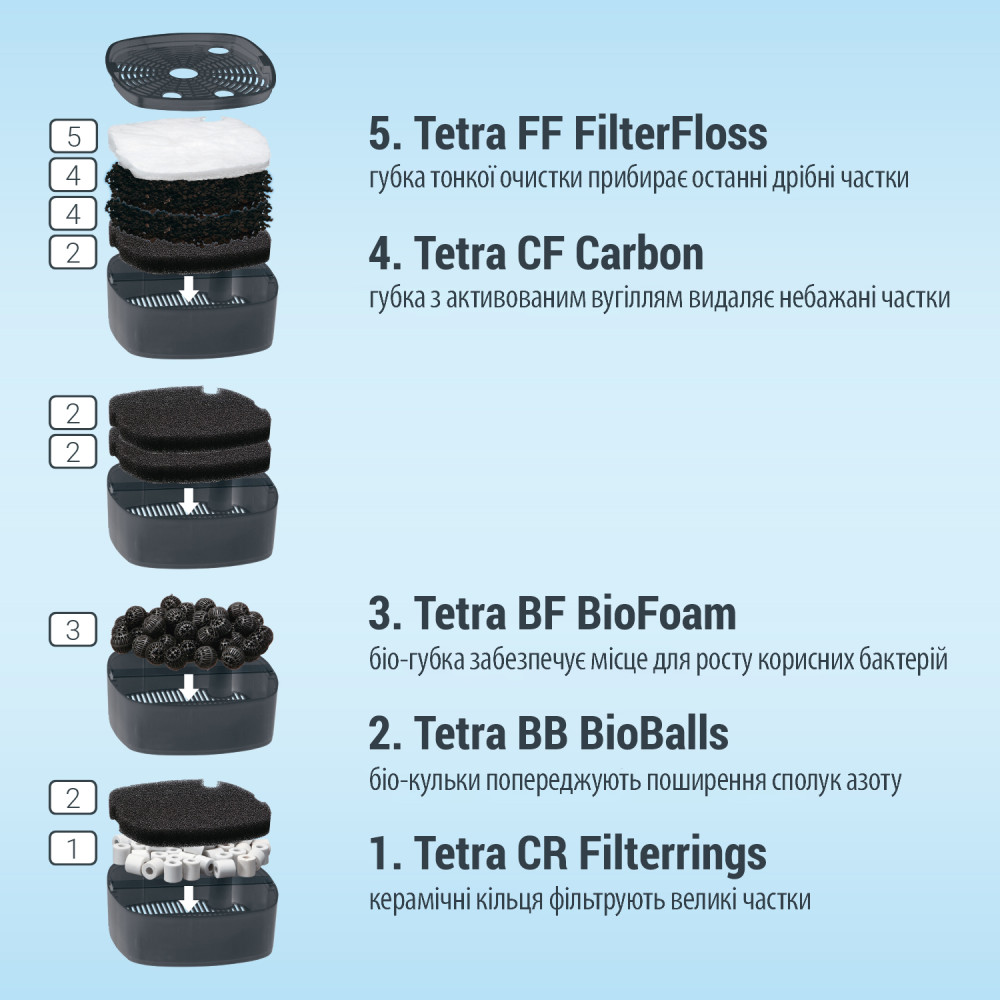 Многоуровневая система фильтрации с различными наполнителями (фильтрующие кольца, угольные фильтрующие вещества, усовершенствованная биогубка, губка тонкой очистки и специальные биошарики) эффективно обеспечивает тщательную очистку аквариумной воды путем устранения излишков питательных веществ.