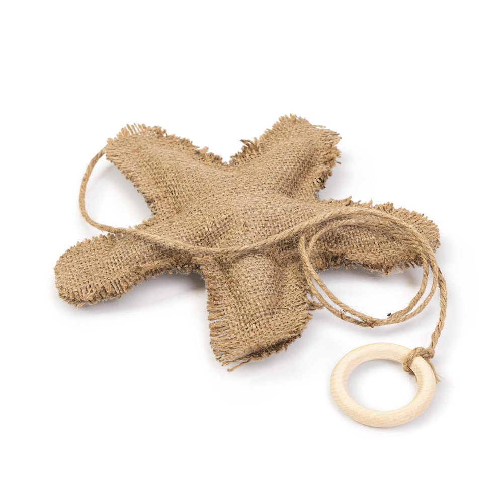 Материалы: мешковина, синтепон, джутовая веревка, деревянное кольцо, пищалка внутри.