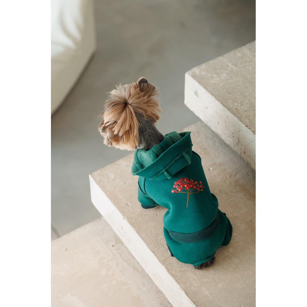 Модный изумрудный цвет, теплый и мягкий материал, очень удобный крой – именно то, что нужно стильным украинским хвостикам для веселого досуга. Ягоды калины на спинке – не только яркий акцент, это один из древнейших символов Украины, олицетворение красоты и благополучия, подчеркивающий: украинские песики – лучшие!