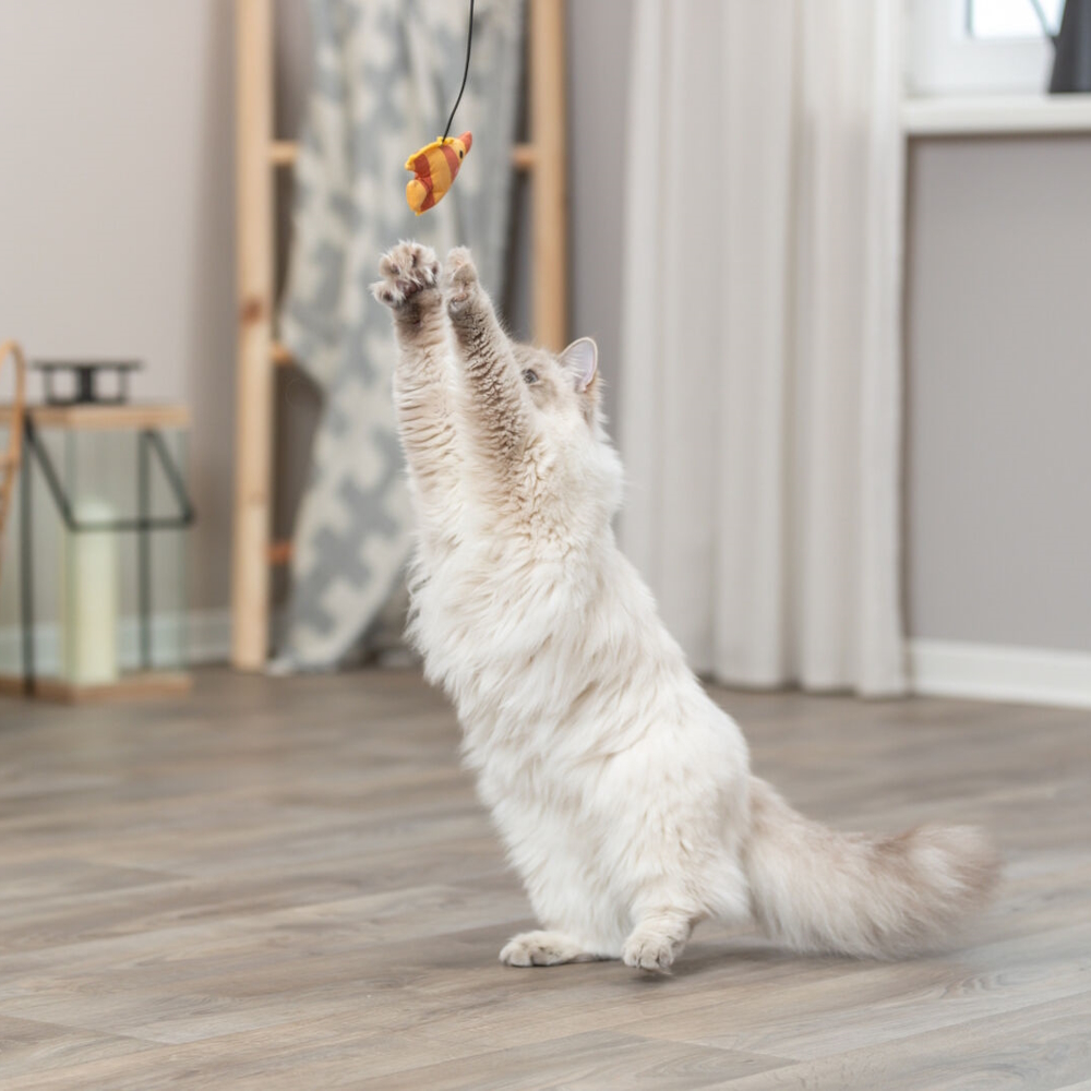 Іграшка для котів Trixie Паличка з плюшевою рибою і котячою м'ятою – це ідеальний вибір для активних ігор з вашим улюбленцем. М'яка плюшева рибка з котячою м'ятою пробуджують природні інстинкти кота, стимулюючи його до активних стрибків та полювання. Паличка дозволяє легко керувати іграшкою, роблячи гру з вашою кішкою ще більш захопливою.