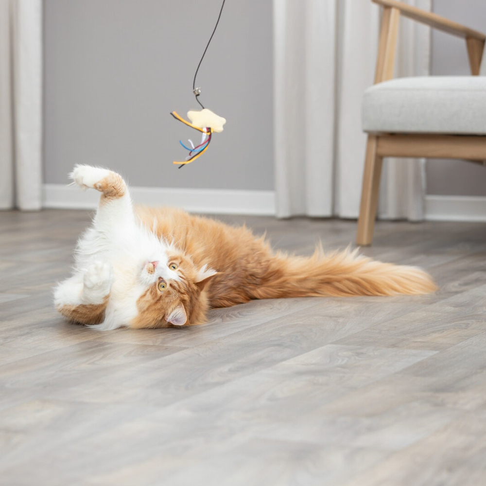 Іграшка для котів Trixie Паличка з плюшевою зіркою і котячою м'ятою – це ідеальний вибір для активних ігор з вашим улюбленцем. М'яка плюшева зірка з котячою м'ятою і дзвіночок пробуджують природні інстинкти кота, стимулюючи його до активних стрибків та полювання. Паличка дозволяє легко керувати іграшкою, роблячи гру з вашою кішкою ще більш захопливою.