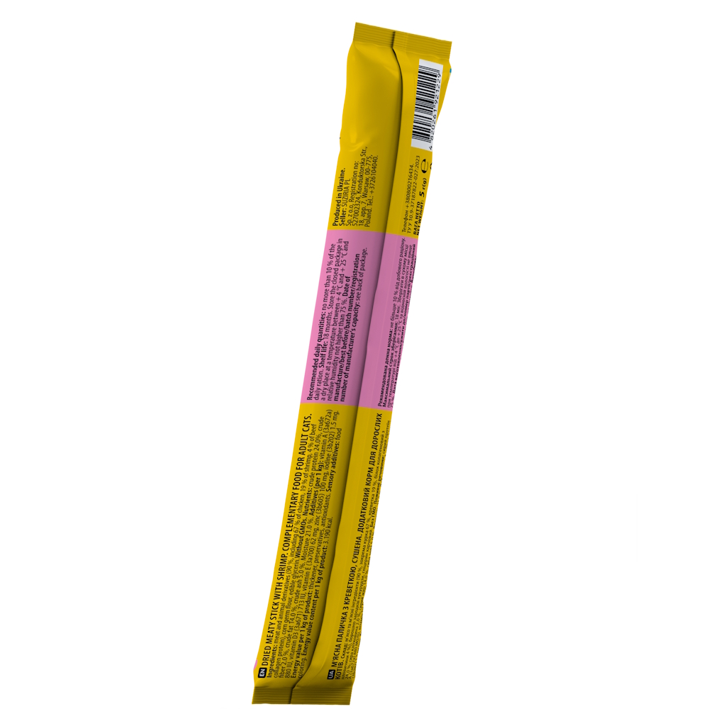 М’ясна паличка для котів. Додаткове харчування, яке можна використовувати як частування, для заохочення, або для закріплення бажаної поведінки. М’яка текстура дозволяє легко розділити паличку на шматочки навіть для котиків з чутливими зубами та яснами.