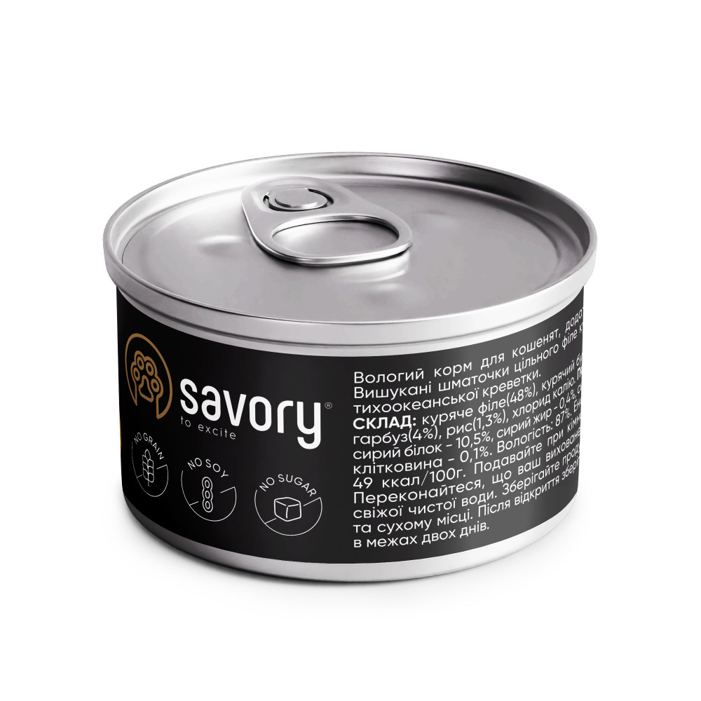 Вологий корм для кошенят, додаткове харчування. Делікатесні шматочки цільного філе курки з додаванням тихоокеанської креветки, дієтичного рису та стиглого гарбуза. Без барвників. Без консервантів. Без сої. Без ГМО.