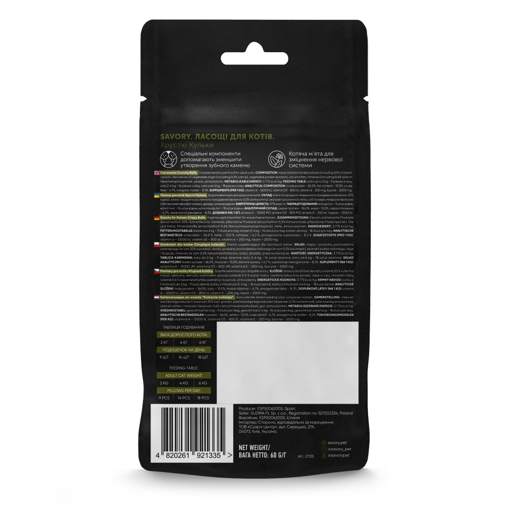 Додаткове харчування для котів, збагачене вітамінами і таурином. Хрусткі кульки покращують кровообіг ясен та механічно очищують зубний наліт. Також добре підходять для літніх вихованців та тих, хто має проблему чутливості зубів.