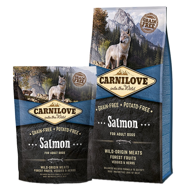 Особенность Carnilove Salmon Adult Dog: 70 % мясо диких животных; 30 % лесные ягоды, овощи и травы. Без зерна и картофеля.