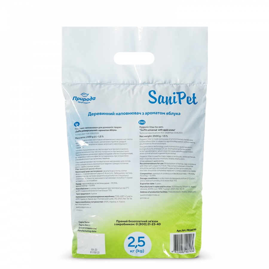 Якість продукту відповідає європейським стандартам. Сировина – виключно свіжа деревина без гнилизни та грибка. Природний фруктовий аромат приваблює тварин. Лоток після використання продукту дуже легко миється. Ваш улюбленець буде із задоволенням користуватися туалетом з таким наповнювачем.