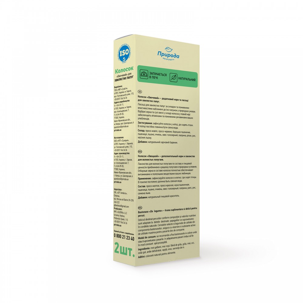 Повноцінні вітамінізовані ласощі мають високу поживну цінність і смакові якості завдяки спеціальній технології обробки інгредієнтів. Склад колосків наближений до їжі папуг в природних умовах. Добірні зерна забезпечують птахів енергією.