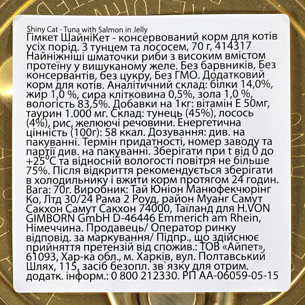 Консерви для котів Shiny Cat тунець і лосось – делікатесний вологий корм, готовий до споживання. Виготовлений з високоякісного м’яса тунця та лосося. Не містить штучних барвників, підсилювачів смаку, консервантів і ГМО.