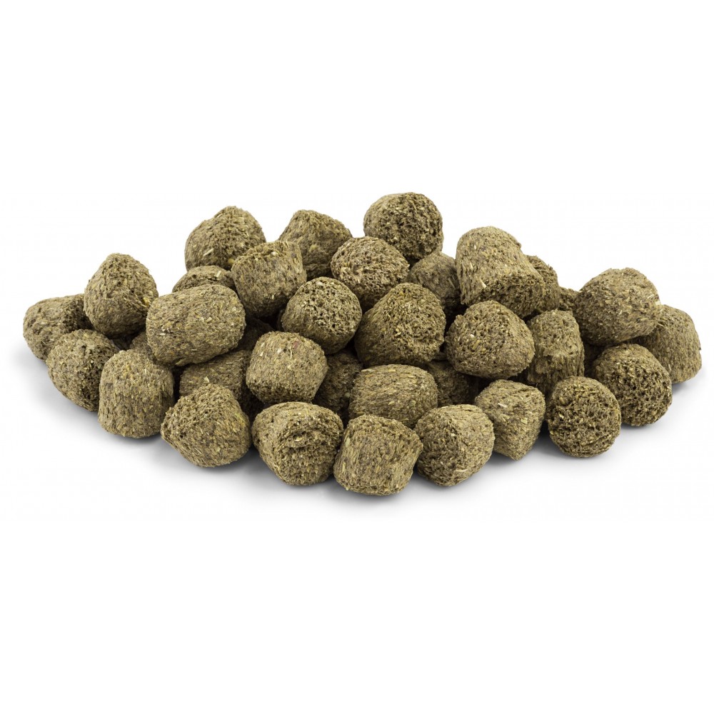 Склад: продукти рослинного походження (тимофіївка лучна 10%), кукурудза (маїс 4%), овочі (морква сушена 1%), рослинні екстракти білка, інулін 2.1%, мінерали, олія і жири (ріпакова олія 0.5%), екстракт юки Шидигера, кальцій - 0.70%, фосфор - 0.40%, сира клітковина 20.0%.