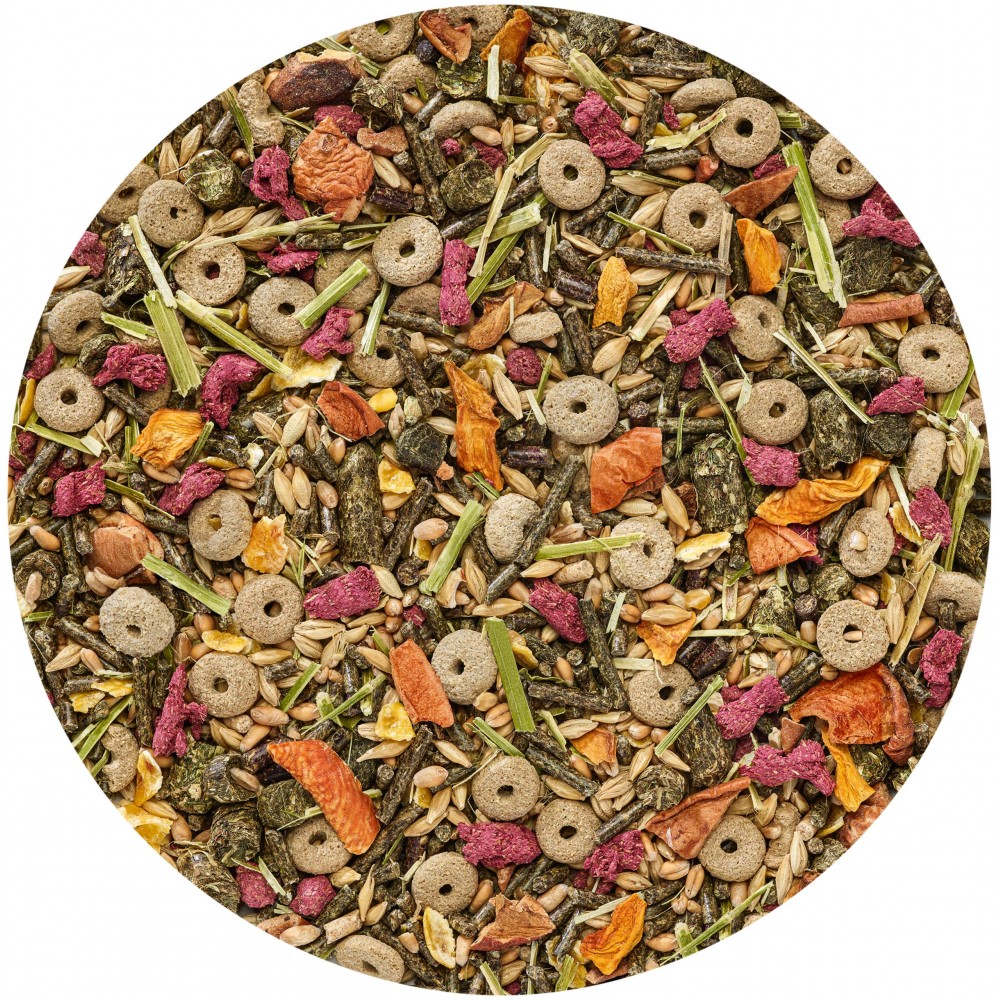 Склад: Злаки - 54.5%, Продукти рослинного походження, Овочі (буряк 2.6%, сушений гарбуз 1%), Фрукти (сушені яблука 1%), Мінерали, Олії і жири (рапсова олія 0.2%), Екстракт юки Шидигера, Сира клітковина- 12.5%.