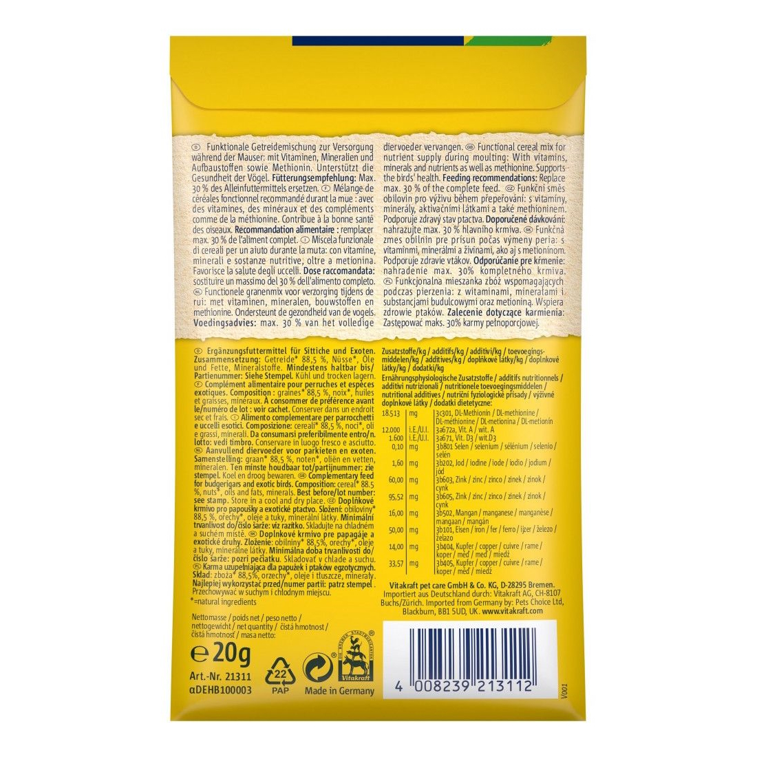 Каталог товаров : Вітамінні добавки та вітаміни для птахів > Вітамінна добавка для хвилястих та екзотичних папуг Vitakraft під час линьки 20г