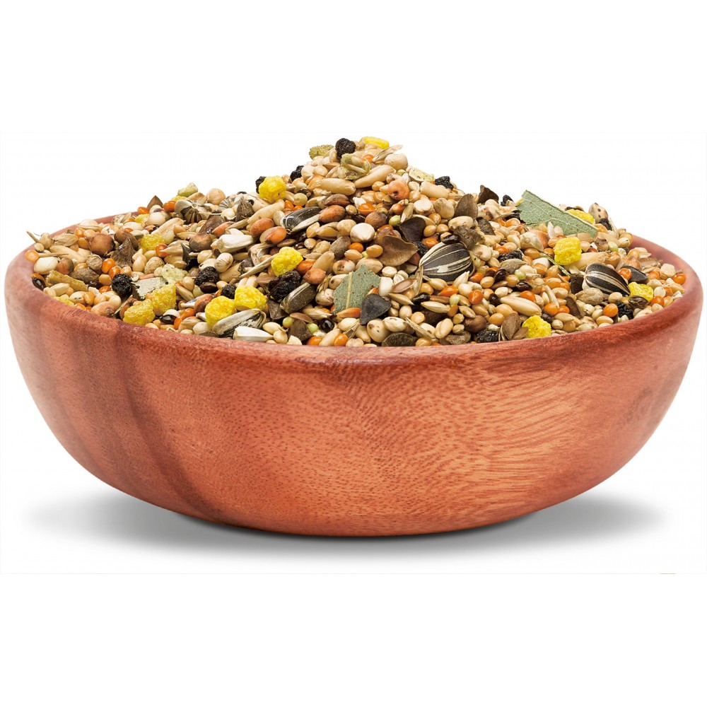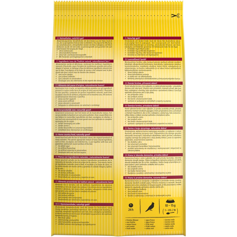 Склад корму відповідає раціону птаха у природному середовищі. Батьківщиною багатьох великих птахів є Австралія, тому корм містить суміш таких інгредієнтів, як ківі, евкаліпт, бузина, насіння лугових трав. Крім основних інгредієнтів, корм містить вітаміни й інші поживні речовини, які необхідні великим птахам для здорового способу життя.