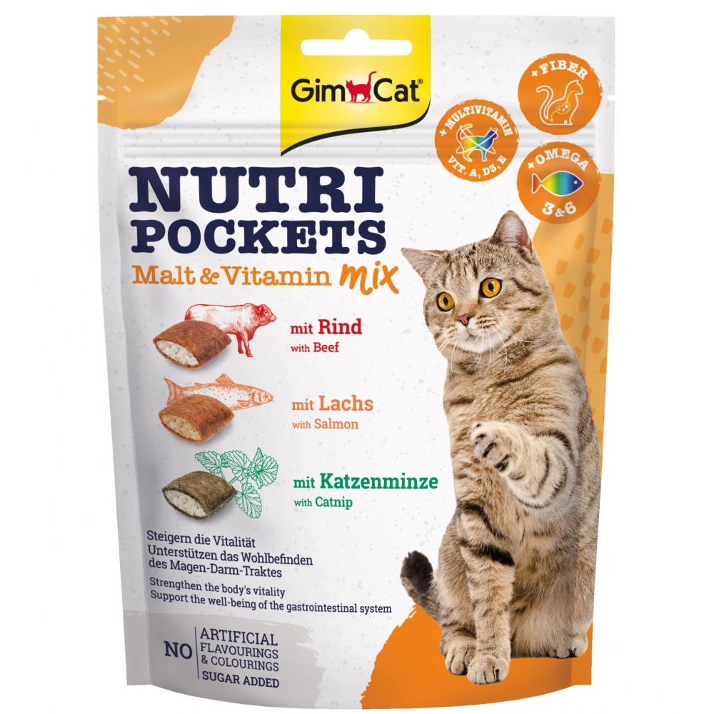 Описание: Витаминные лакомства GimCat Nutri Pockets Мальт-Витамин Микс – хрустящие подушечки с вкусной начинкой из кошачьей мяты, говядины с солодом и лососем.