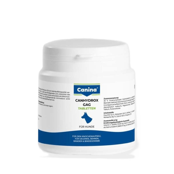 CANINA® CANHYDROX GAG был специально разработан для больших и тяжелых пород собак. Он обеспечивает высококачественное питание соединительной ткани, суставов, костей, сухожилий, связок, хрящей и зубов. Молодые собаки, а также работающие и стареющие собаки получают пользу от этого «универсального» продукта для опорно-двигательного аппарата!