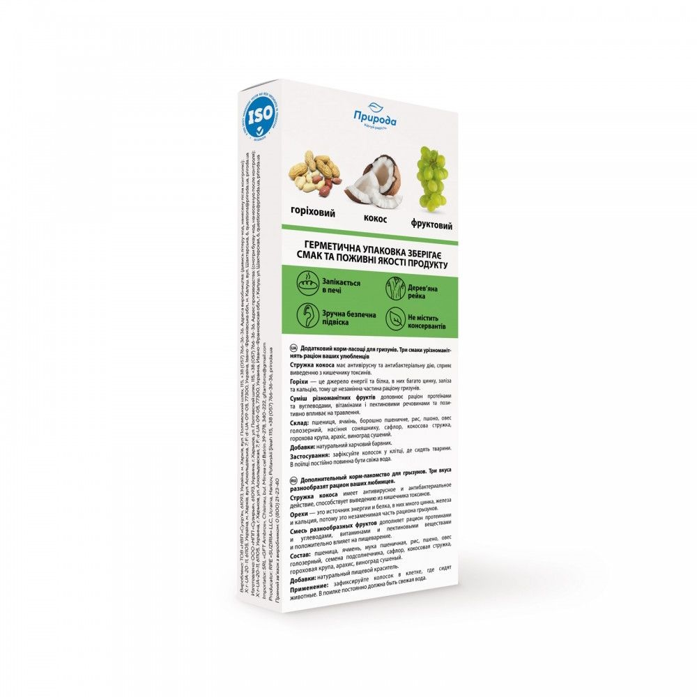 Склад: овес, ячмінь, пшениця, насіння соняшнику, сафлор, арахіс, рис, кокосова стружка, горохова крупа, пшоно, виноград сушений