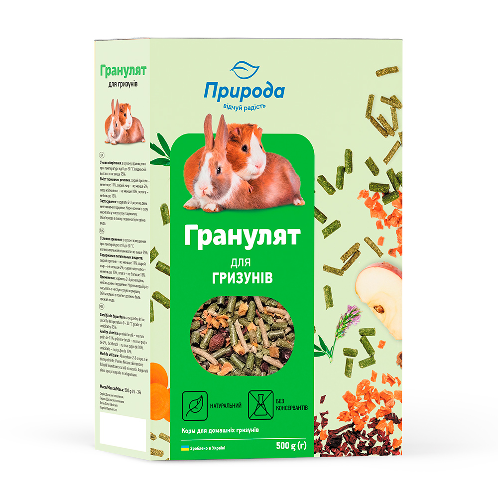 Рецептура корму «Гранулят для гризунів» розроблена на основі рекомендацій провідних фахівців з розведення декоративних гризунів