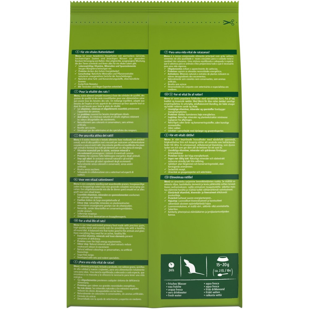 Меню Vital - це збалансований раціон з цінним зерном, смачними фруктами та хрусткими горіхами для здорового всебічного харчування пацюків. Корм збагачений формулою Vita® Herbs - ретельно відібраною композицією цінних трав, таких як чебрець і м'ята, а також квітів гібіскуса і ромашки, які підтримують здоров'я. Білки забезпечують важливі амінокислоти і є оптимальним джерелом енергії для активних щурів. Спеціальна комбінація з натуральних інгредієнтів пов'язує неприємні запахи і зменшує їх утворення.