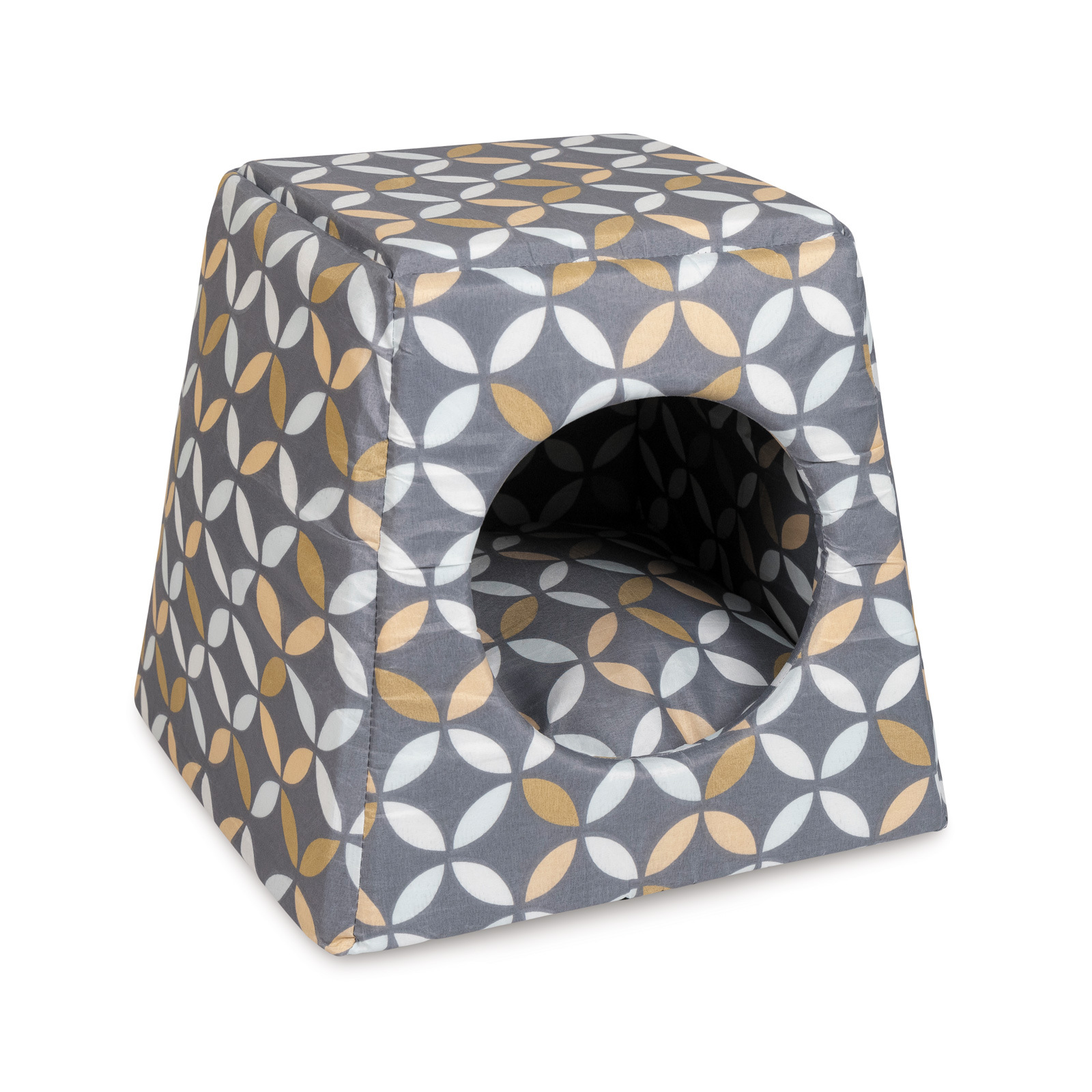 Описание: Практичный дом из мягкой хлопковой ткани придется по вкусу не только котам, но и небольшим собакам. Лежак-трасформер можно использовать в 2 положениях: как домик с круглым входом и мягкой подушкой внутри; как лежак-диванчик– достаточно надавить ладонью на «крышу» домика, предварительно вынув из него подушку, а затем уложить ее обратно в лежачок.