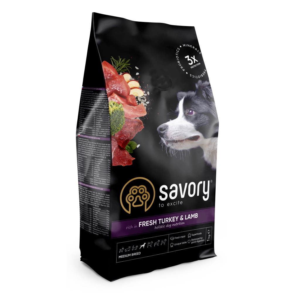 Сухий корм для собак середніх порід Savory містить 50 % якісного м’яса індички та ягняти, суперфуди, цукіні, шпинат і помідори. Ці компоненти створені природою для завжди бадьорого і життєрадісного песика.