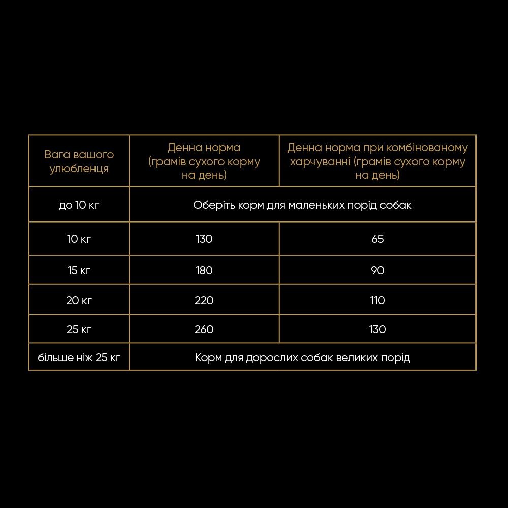 Вага вашого улюбленця  Денна норма (грамів сухого корму на день) Денна норма при комбінованому харчуванні (грамів сухого корму на день)