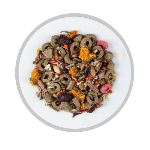 Склад: трав’яний гранулят в асортименті, комбікорм, протеїново-мінеральний гранулят, овес голозерний, ячмінь, чечевиця червона, кероб подрібнений, злаково-овочевий гранулят, пшениця повітряна, сушений пастернак, сушений гарбуз, сушена морква, коріння кульбаби, шипшина, сушене яблуко, гібіск, насіння льону, насіння гарбуза очищене, сушений буряк, квіти календули.