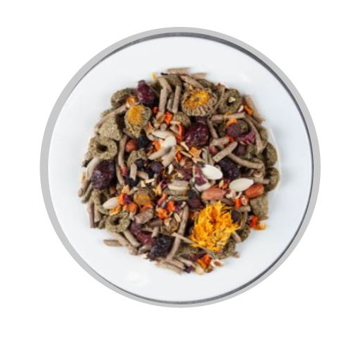 Склад: комбікорм, трав’яний гранулят в асортименті, овес голозерний, маїс, протеїново-мінеральний гранулят, насіння розторопші, повітряна пшениця, сушений гарбуз, яблука сушені гранульовані, сочевиця червона, гібіск, сушений буряк, морква сушена, насіння гарбуза, шипшина, кероб подрібнений, глід, квіти календули, аронія, арахіс, пастернак сушений, насіння льону.