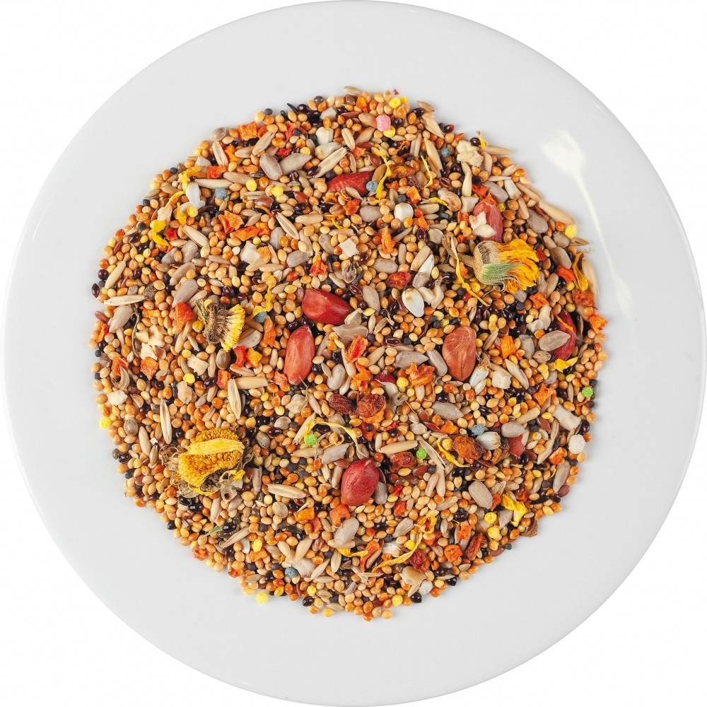 Склад: просо жовте, просо червоне, овес голозерний, просо чорне, канаркове насіння, очищене насіння соняшнику, рапс, насіння льону, сушена морква, сафлор, абіссінський нуг, сушене яблуко, арахіс, насіння конопель, рисові кульки, обліпиха сушена, квіти календули.