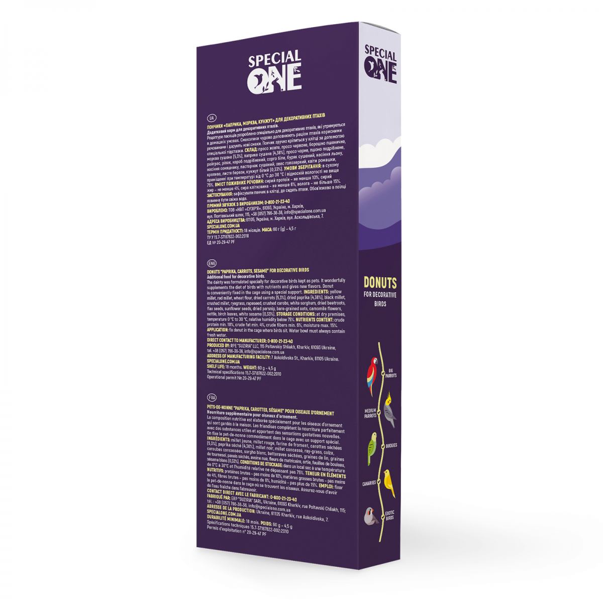 Рецептура ласощів розроблена спеціально для декоративних птахів, які утримуються в домашніх умовах. Смаколики чудово доповнюють раціон птахів корисними речовинами і дарують нові смаки. Паприка, сушена морква, кунжут білий та пастернак зміцнюють імунітет, покращують стан шкіри та оперення, прискорюють регенерацію. Пончик зручно кріпиться у клітці за допомогою спеціального тримача.