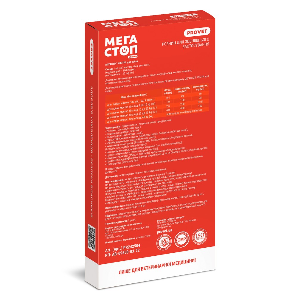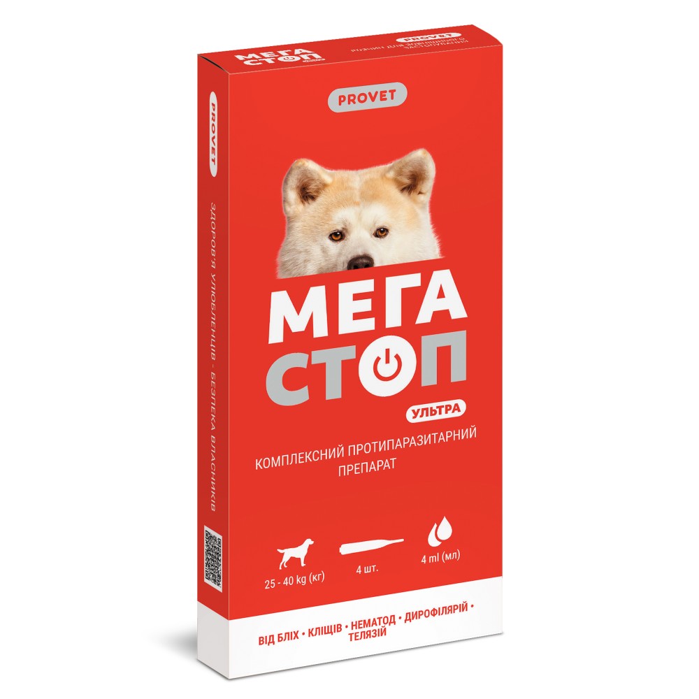 Описание: Краплі PROVET Мегастоп Ультра для собак 25-40 кг, 4 піпетки по 4,0 мл (інсектоакарицид, антигельмінтик)