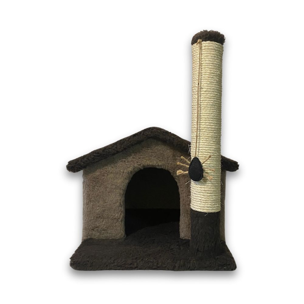 Ця модель дряпки ідеально підходить вихованцям різного віку. Дорослі тварини зможуть комфортно відпочити в просторому будинку і поточити кігті, а малюки із задоволенням будуть стрибати на дах будиночка і грати з помпоном, прикріпленим до стовпчика-дряпки.