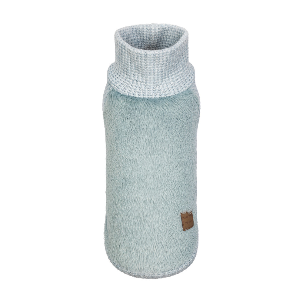 Нежный голубой цвет, изысканные линии, интересное сочетание фактур сразу привлекают внимание. Свитер не только красив, но очень удобен – хвостики это оценят сразу. Материал чрезвычайно мягкий и пушистый, поэтому песику в ветреную прохладную погоду будет тепло и уютно.