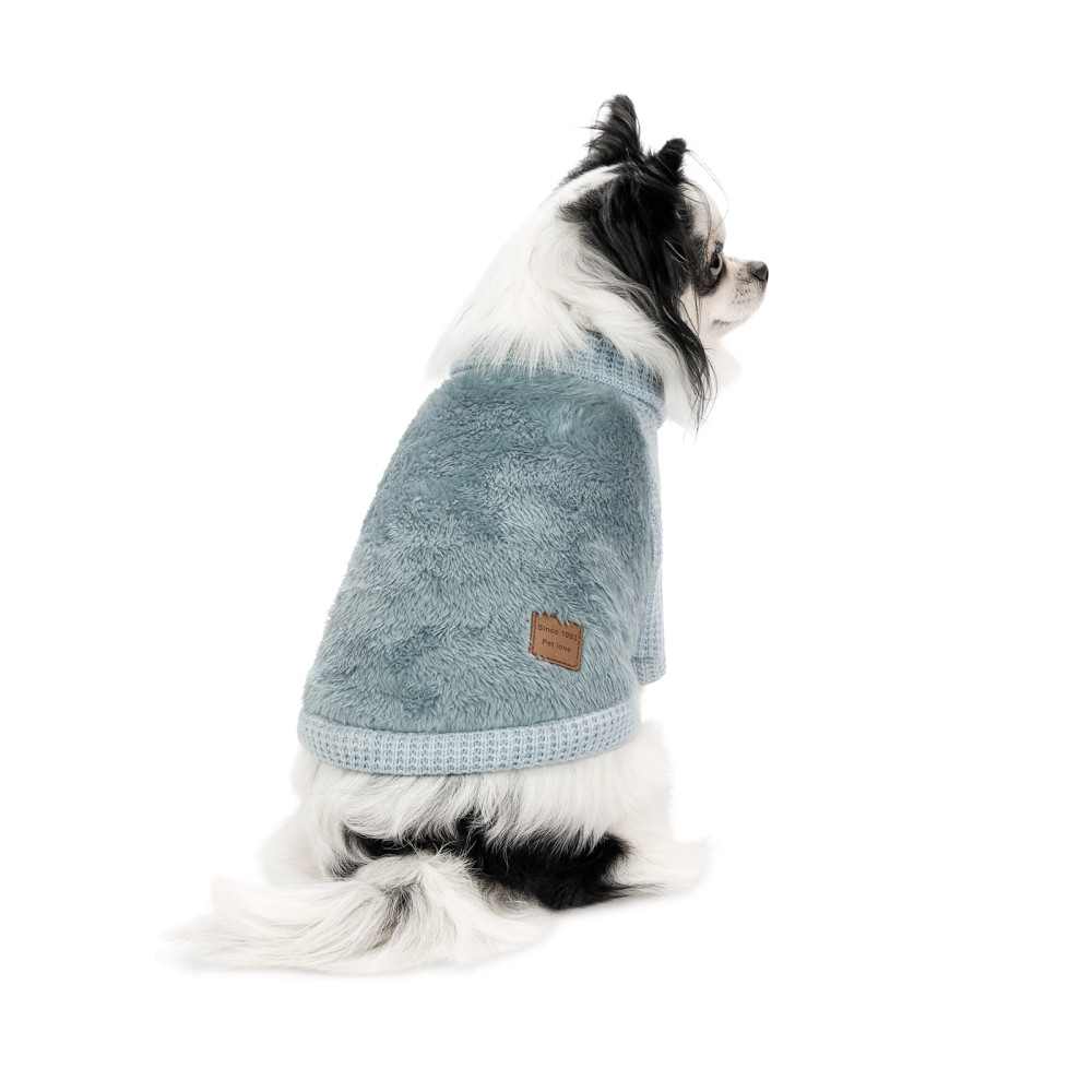 Нежный голубой цвет, изысканные линии, интересное сочетание фактур сразу привлекают внимание. Свитер не только красив, но очень удобен – хвостики это оценят сразу. Материал чрезвычайно мягкий и пушистый, поэтому песику в ветреную прохладную погоду будет тепло и уютно.