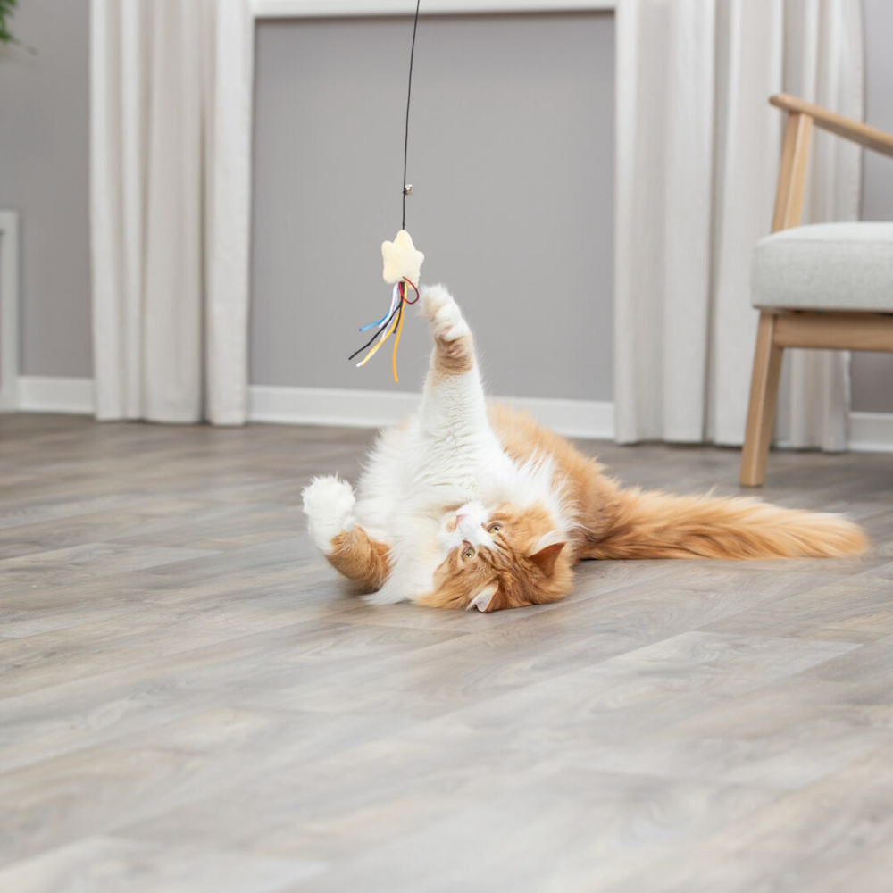 Іграшка для котів Trixie Паличка з плюшевою зіркою і котячою м'ятою – це ідеальний вибір для активних ігор з вашим улюбленцем. М'яка плюшева зірка з котячою м'ятою і дзвіночок пробуджують природні інстинкти кота, стимулюючи його до активних стрибків та полювання. Паличка дозволяє легко керувати іграшкою, роблячи гру з вашою кішкою ще більш захопливою.