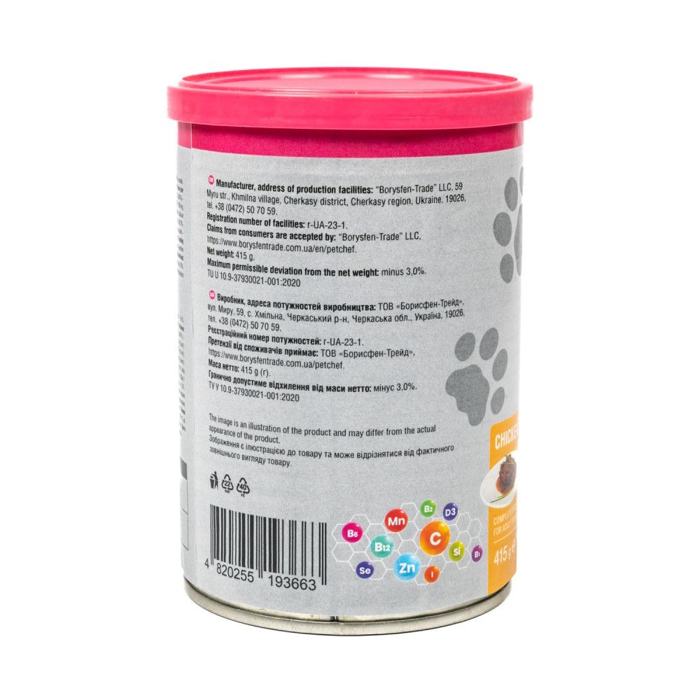 Повнораціонний корм для дорослих собак консервований. Шматочки в желе з куркою ТМ Pet Chef 415 г